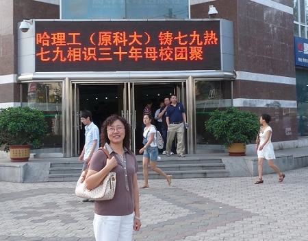 下榻在学府宾馆,正门的电子屏幕上打出了我们热79、铸79两班同学相识三十年聚会的字幕