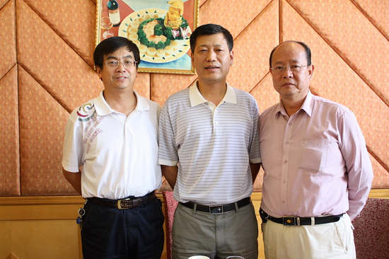 校工会主席、校友总会副会长杨春与云南校友会名誉会长杨光斗(右)、会长陈福忠(左)合影