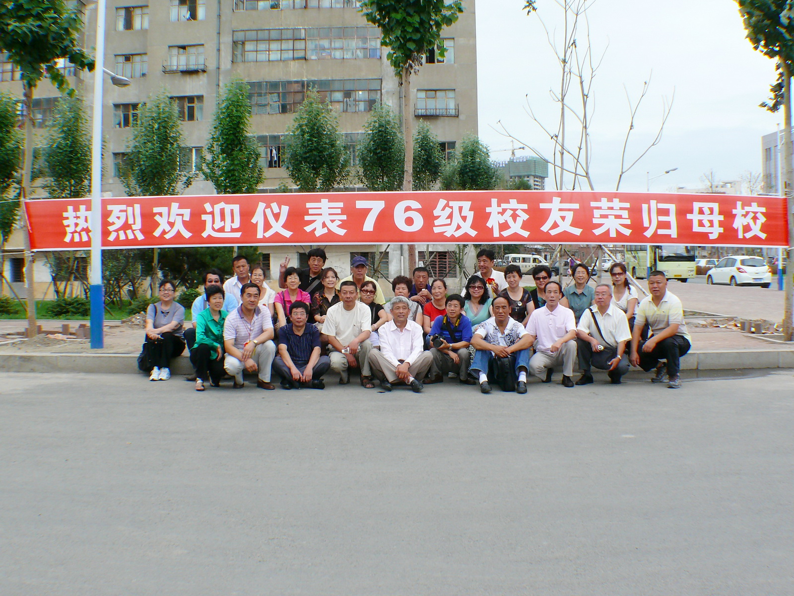 校友在学校制作的欢迎条幅前合影