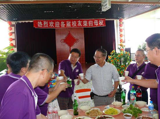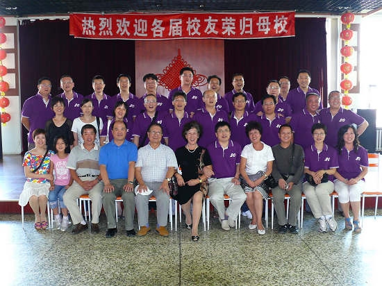 校友在学校为欢迎他们制作的条幅前合影