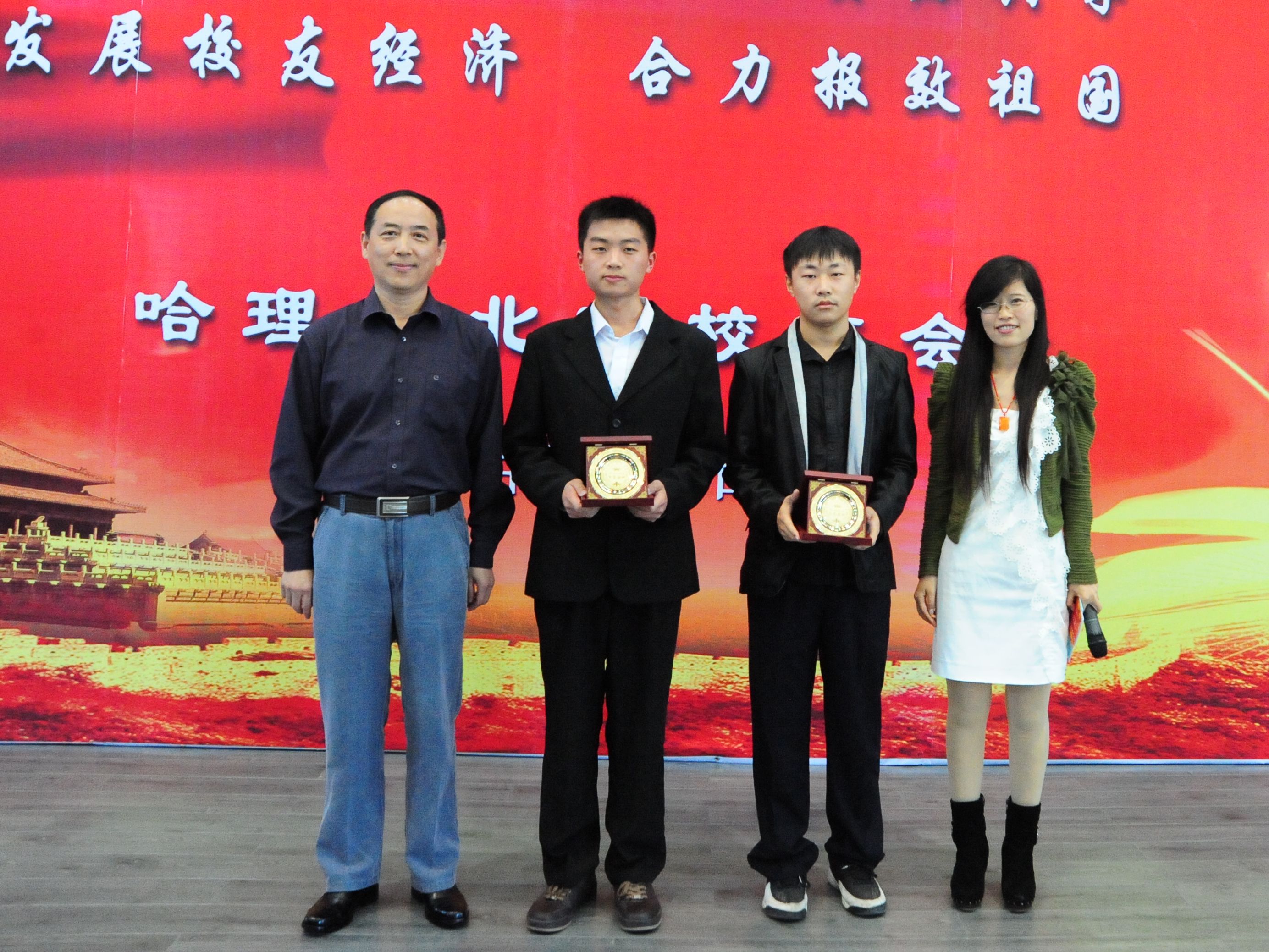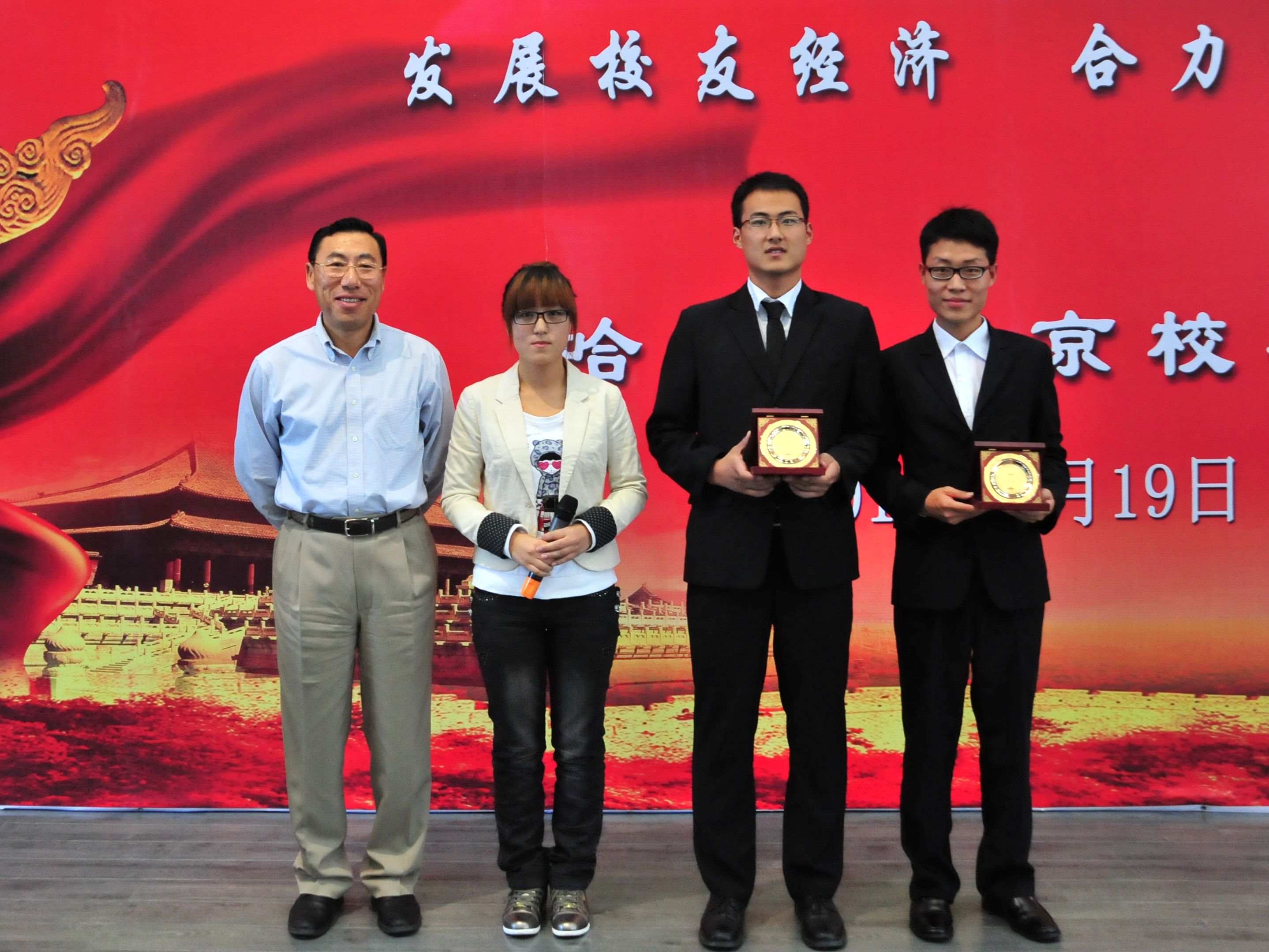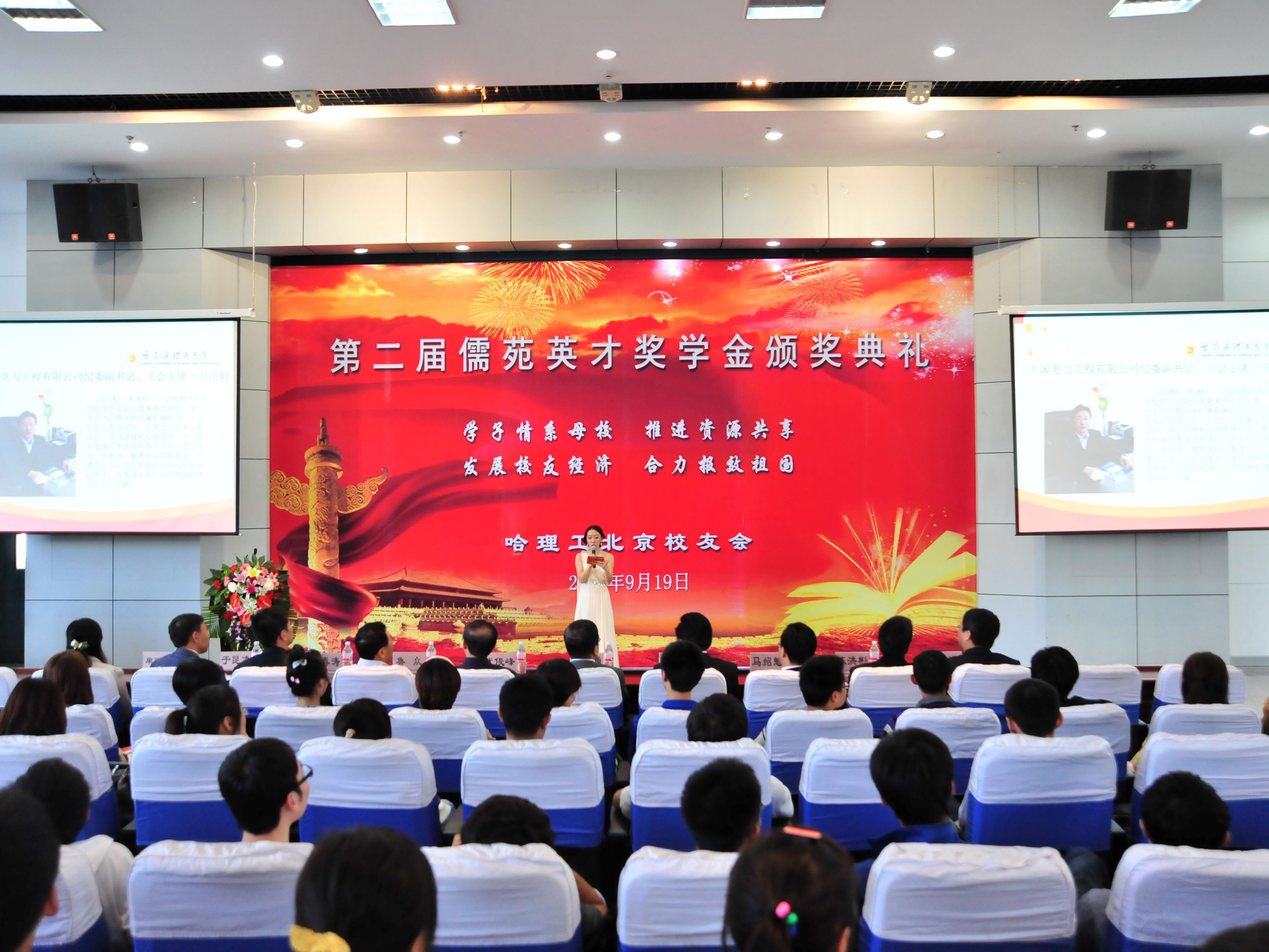 金色九月,秋高气爽、硕果飘香。2012年9月19日,正值哈尔滨理工大学62岁生日之际,北京校友会特举办第二届儒苑英才奖学金颁奖典礼。下午14时,颁奖典礼在学校西区一号楼0220报告厅拉开帷幕。校长李大勇、副校长武俊峰,北京校友会常务副会长赵若林、副会长鲁众、副会长兼秘书长马绍魁、副会长于昆凌、副秘书长刘洋等13名北京校友出席颁奖典礼,学生处处长满春涛、校友办公室主任陈洪彬、团委书记单鹂娜、部分学院辅导员、8名获奖学生及600余名同学共同参加了颁奖典礼。本届颁奖典礼由北京校友会校友白杨主持。