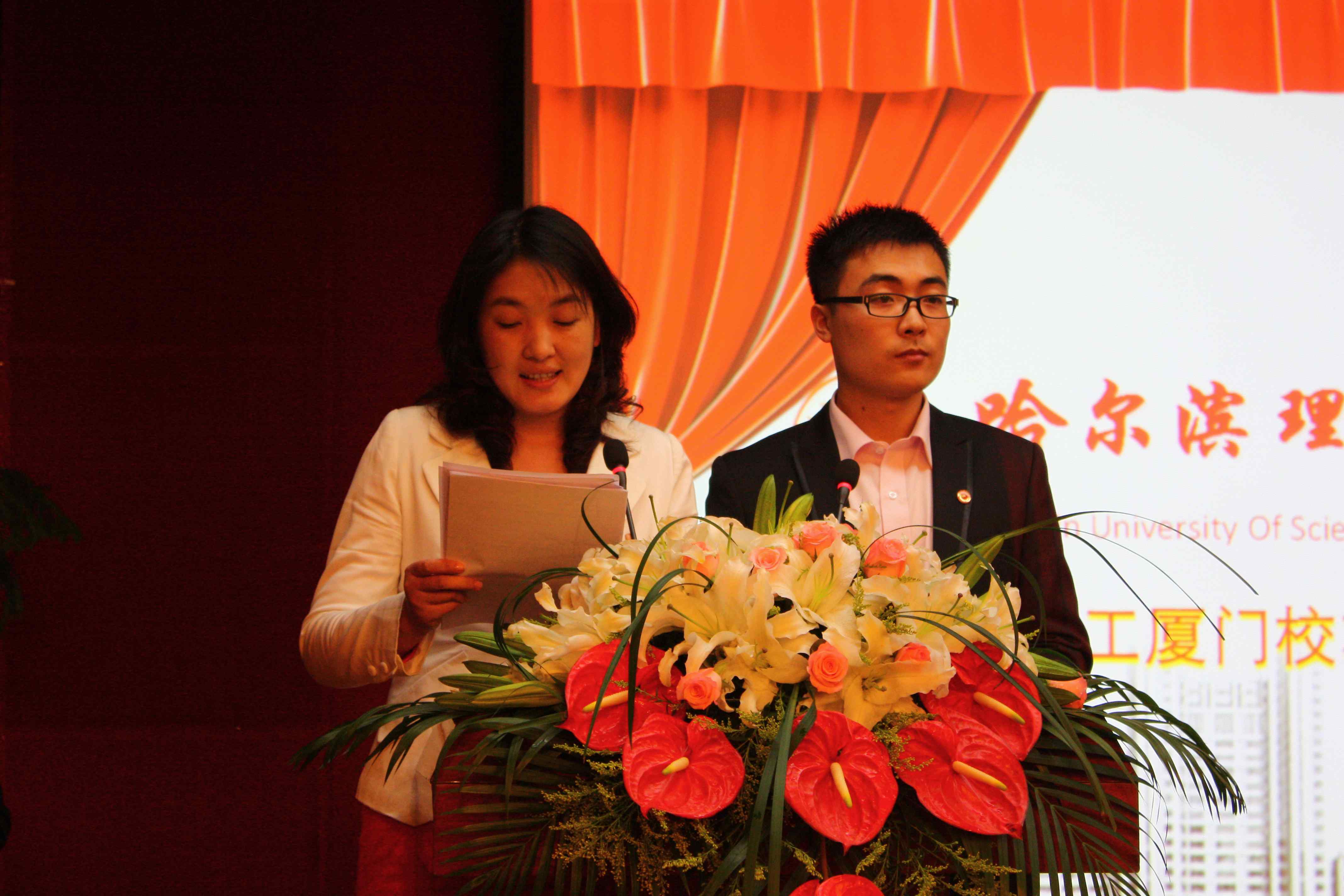 校友李霞、尤泽革主持大会