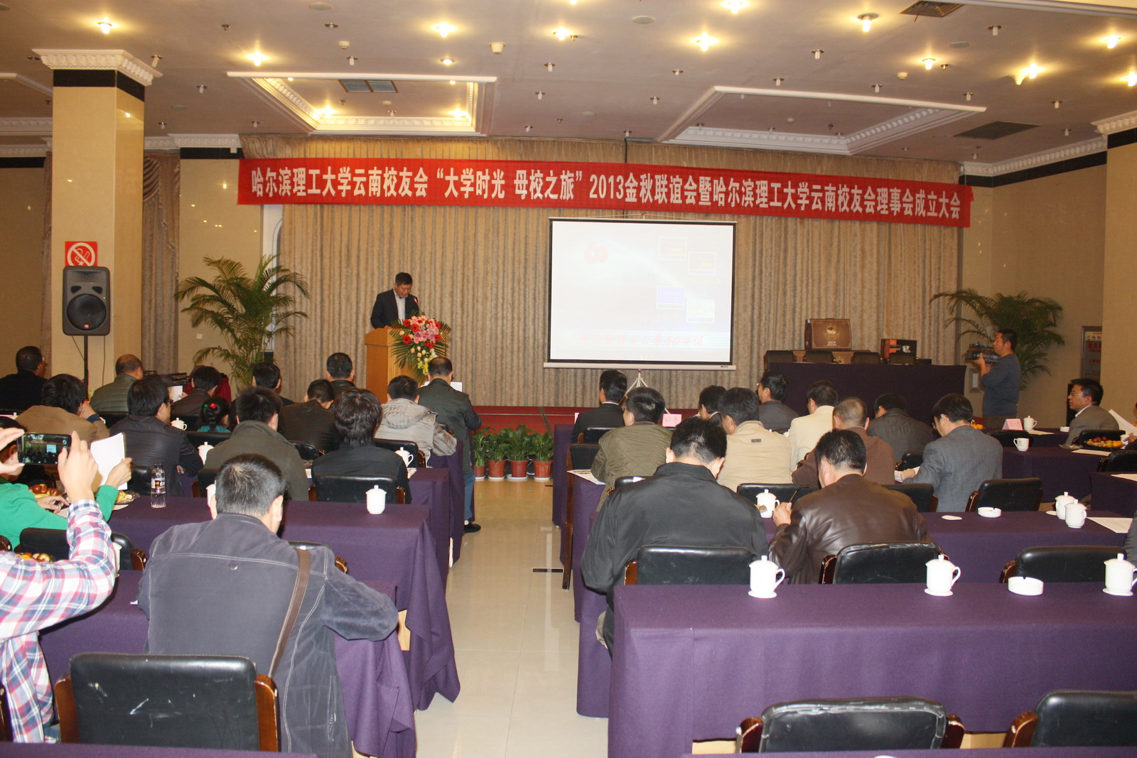 10月19日,云南校友会“大学时光母校之旅”2013金秋联谊会暨哈尔滨理工大学云南校友会理事会成立大会在昆明云安会都成功召开。校工会主席、校友总会副会长杨春代表学校出席会议,校友办公室主任、校友总会秘书长陈洪彬,招生就业处副处长高山一同参加。云南校友会名誉会长杨光斗(管专82级),校友会会长陈福忠(电缆78级)等近60余名校友出席会议。会议选举了云南校友会理事会,理事长,理事。