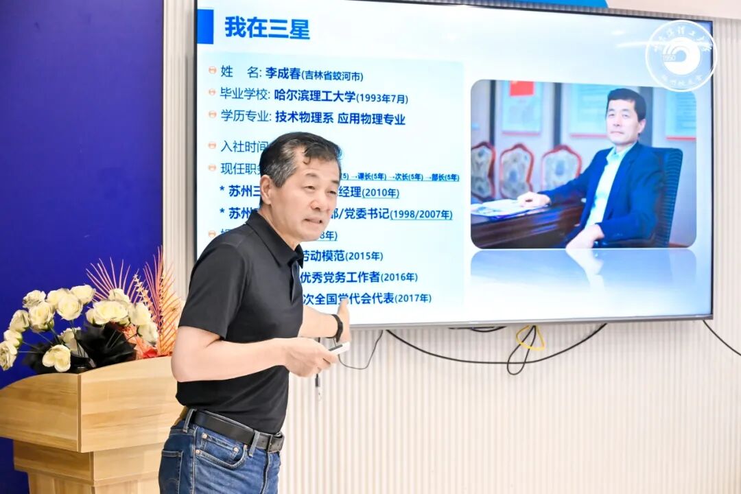 在备受期待的职场经验分享环节,李成春师兄(苏州三星半导体 党委书记、副总经理)以幽默风趣的语言,结合自己从职场新人到企业高管的成长历程,分享了极具实用价值的职场心得。他的讲述既生动有趣又饱含智慧,提炼“态度+能力”双轨并进的职场哲学,提出从“优秀”到“超级”员工的进阶理念,现场掌声阵阵。在场校友纷纷表示,这场分享不仅轻松愉快,更让人受益匪浅,为初入职场的师弟师妹们提供了宝贵的经验指引。